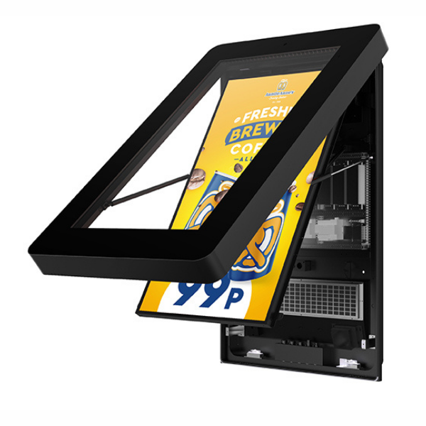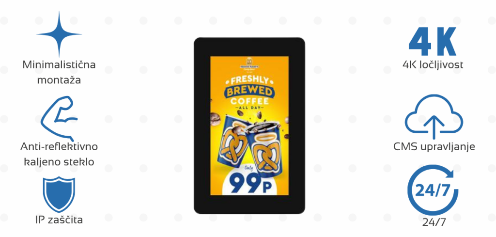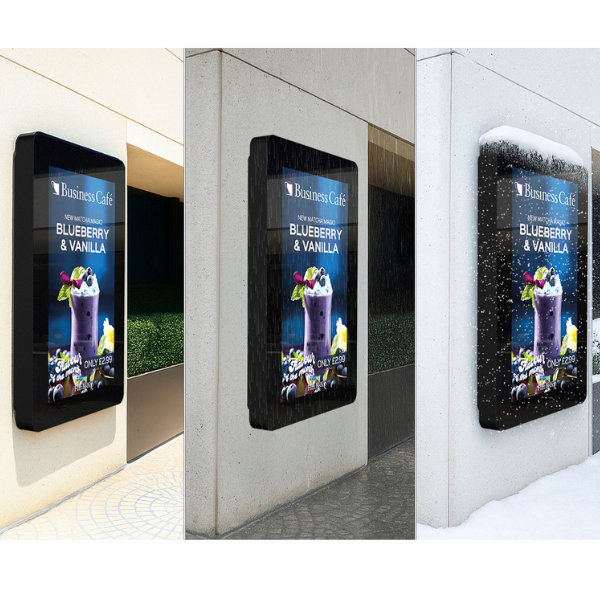 4K Elite Outdoor Display je premium stenski digitalni zaslon, zasnovan za odlično vidljivost in trajnost v vseh vremenskih pogojih, brez kompromisov glede kakovosti slike. Napredna 4K ločljivost in ultra-visoka svetilnost (do 3 500 cd/m²) zagotavljata jasen in živahen prikaz vsebin tudi pri neposredni sončni svetlobi. Prvovrstna zaščita IP56, dvojno tesnjenje in anti-reflektivno steklo ščitijo pred dežjem, prahom in vandalizmom.